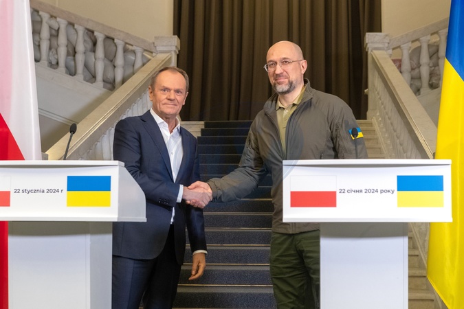 KYIV, UKRAINE - JANUARY 22, 2024 - Ukrainian Prime Minister Denys Shmyhal (R) and Polish Prime Minister Donald Tusk shake hands during a joint briefing, Kyiv, capital of Ukraine, Credit:Pavlo Bahmut / Avalon