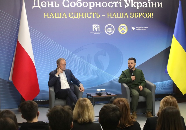 KYIV, UKRAINE - JANUARY 22, 2024 - President of Ukraine Volodymyr Zelenskyy (R) and Prime Minister of Poland Donald Tusk are pictured during a joint meeting with students at the National University of Kyiv-Mohyla Academy, Kyiv, capital of Ukraine, Credit:Volodymyr Tarasov / Avalon