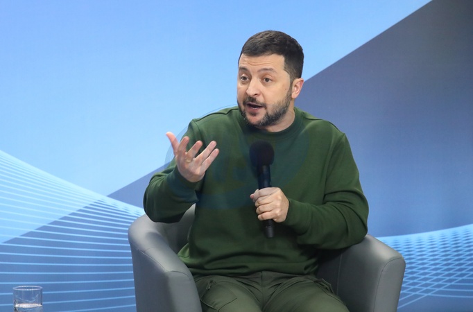 KYIV, UKRAINE - JANUARY 22, 2024 - President of Ukraine Volodymyr Zelenskyy speaks during a joint meeting with Prime Minister of Poland Donald Tusk and students at the National University of Kyiv-Mohyla Academy, Kyiv, capital of Ukraine, Credit:Volodymyr Tarasov / Avalon
