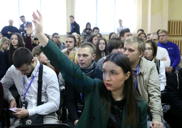 KYIV, UKRAINE - JANUARY 22, 2024 - Students ask questions during a meeting with President of Ukraine Volodymyr Zelenskyy and Prime Minister of Poland Donald Tusk at the National University of Kyiv-Mohyla Academy, Kyiv, capital of Ukraine, Credit:Volodymyr Tarasov / Avalon