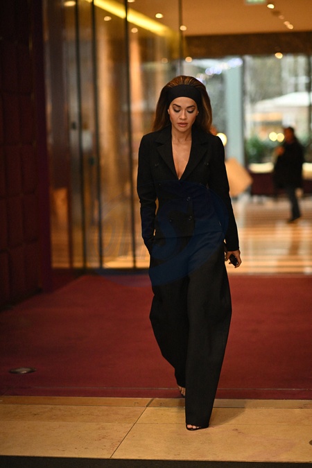 Rita Ora quitte l'hôtel Mandarin Oriental à Paris, en marge de la Fashion Week Haute Couture printemps-été 2024