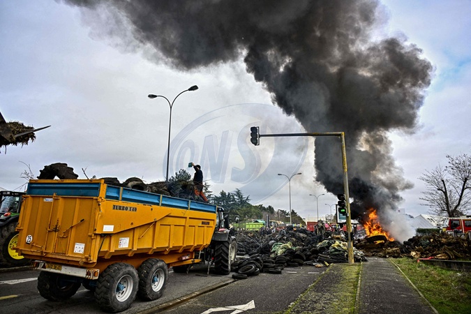 Les Agriculteurs déversent du fumier devant la Direction Départementale du Territoire à Agen, le 23 janvier 2024. © Thierry Breton / Panoramic / Bestimage Farmers dump manure in front of the Departmental Territorial Directorate in Agen, January 23, 2024.