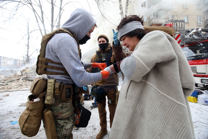 KHARKIV, UKRAINE - JANUARY 23, 2024 - A first responder bandages the hand of an injured woman after the Russian missile attack on Kharkiv, northeastern Ukraine. As reported, the Russian missile strike which took place Tuesday morning, January 23, has claimed the lives of seven people and has left 63 people injured in the northeastern Ukrainian city of Kharkiv., Credit:Vyacheslav Madiyevskyy / Avalon