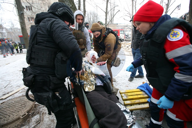 KHARKIV, UKRAINE - JANUARY 23, 2024 - First responders put an injured man on the stretcher after the Russian missile attack on Kharkiv, northeastern Ukraine. As reported, the Russian missile strike which took place Tuesday morning, January 23, has claimed the lives of seven people and has left 63 people injured in the northeastern Ukrainian city of Kharkiv., Credit:Vyacheslav Madiyevskyy / Avalon