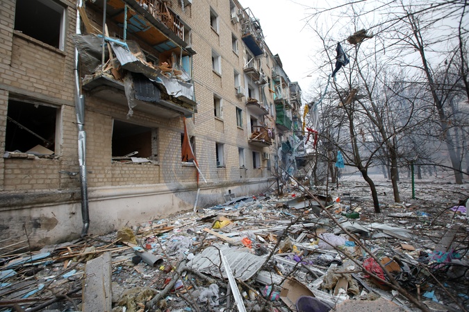 KHARKIV, UKRAINE - JANUARY 23, 2024 - Debris covers the ground outside a destroyed residential building after the Russian missile attack on Kharkiv, northeastern Ukraine. As reported, the Russian missile strike which took place Tuesday morning, January 23, has claimed the lives of seven people and has left 63 people injured in the northeastern Ukrainian city of Kharkiv., Credit:Vyacheslav Madiyevskyy / Avalon