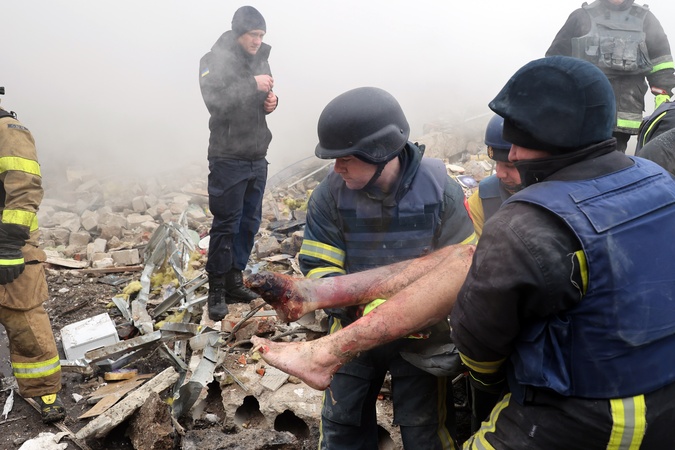 KHARKIV, UKRAINE - JANUARY 23, 2024 - Rescuers carry an injured man with part of the right foot cut off after the Russian missile attack on Kharkiv, northeastern Ukraine. As reported, the Russian missile strike which took place Tuesday morning, January 23, has claimed the lives of seven people and has left 63 people injured in the northeastern Ukrainian city of Kharkiv., Credit:Vyacheslav Madiyevskyy / Avalon