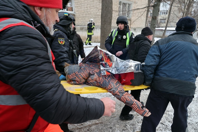 KHARKIV, UKRAINE - JANUARY 23, 2024 - First responders carry an injured woman on the stretcher after the Russian missile attack on Kharkiv, northeastern Ukraine. As reported, the Russian missile strike which took place Tuesday morning, January 23, has claimed the lives of seven people and has left 63 people injured in the northeastern Ukrainian city of Kharkiv., Credit:Vyacheslav Madiyevskyy / Avalon