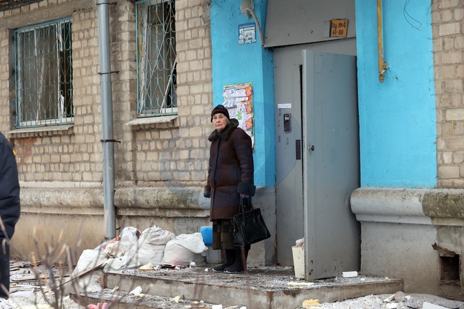 KHARKIV, UKRAINE - JANUARY 23, 2024 - A senior woman stands on the porch at a residential building damaged in the Russian missile attack on Kharkiv, northeastern Ukraine. As reported, the Russian missile strike which took place Tuesday morning, January 23, has claimed the lives of seven people and has left 63 people injured in the northeastern Ukrainian city of Kharkiv., Credit:Vyacheslav Madiyevskyy / Avalon