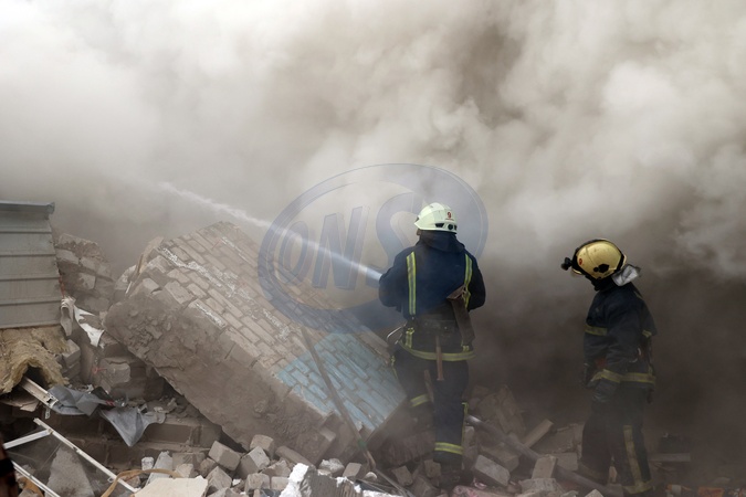 KHARKIV, UKRAINE - JANUARY 23, 2024 - Firefighters put out a fire after the Russian missile attack on Kharkiv, northeastern Ukraine. As reported, the Russian missile strike which took place Tuesday morning, January 23, has claimed the lives of seven people and has left 63 people injured in the northeastern Ukrainian city of Kharkiv., Credit:Vyacheslav Madiyevskyy / Avalon