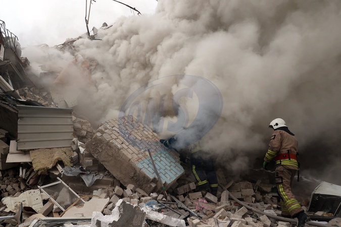 KHARKIV, UKRAINE - JANUARY 23, 2024 - A firefighter walks on the rubble after the Russian missile attack on Kharkiv, northeastern Ukraine. As reported, the Russian missile strike which took place Tuesday morning, January 23, has claimed the lives of seven people and has left 63 people injured in the northeastern Ukrainian city of Kharkiv., Credit:Vyacheslav Madiyevskyy / Avalon