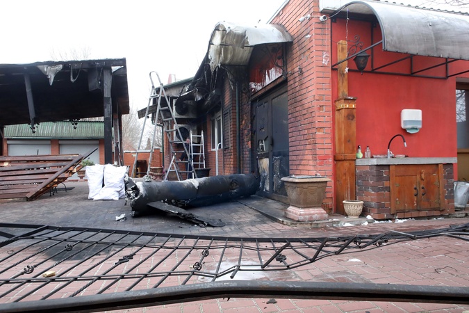 KRIUKIVSHCHYNA, UKRAINE - JANUARY 23, 2024 - A fragment of a downed Russian missile is seen on the ground outside a local cafe after the Russian missile attack on Ukraine that took place Tuesday morning, January 23, Kriukivshchyna, Kyiv region, northern Ukraine., Credit:Volodymyr Tarasov / Avalon