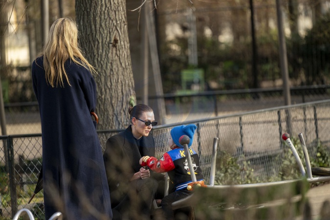 Exclusif - Prix Spécial - No web - Karlie Kloss et son fils Levi jouent au Jardin des Tuileries à Paris en compagnie de Gwyneth Paltrow en marge de la fashion week Haute Couture printemps/été 2024 (PFW) le 22 janvier 2024. Exclusive - No web en Suisse / Belgique Please pixelate child face prior to publication Karlie Kloss and her son play in the Jardin des Tuileries in Paris with Gwyneth Paltrow during the Haute Couture Spring/Summer 2024 (PFW) fashion week on January 22, 2024.