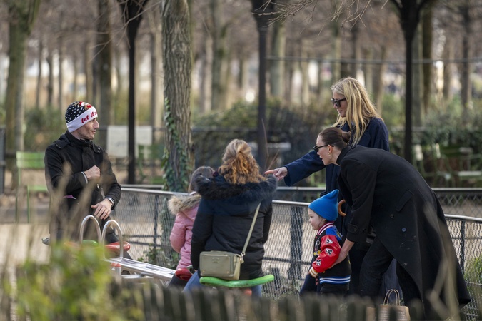 Exclusif - Prix Spécial - No web - Karlie Kloss et son fils Levi jouent au Jardin des Tuileries à Paris en compagnie de Gwyneth Paltrow en marge de la fashion week Haute Couture printemps/été 2024 (PFW) le 22 janvier 2024. Exclusive - No web en Suisse / Belgique Please pixelate child face prior to publication Karlie Kloss and her son play in the Jardin des Tuileries in Paris with Gwyneth Paltrow during the Haute Couture Spring/Summer 2024 (PFW) fashion week on January 22, 2024.
