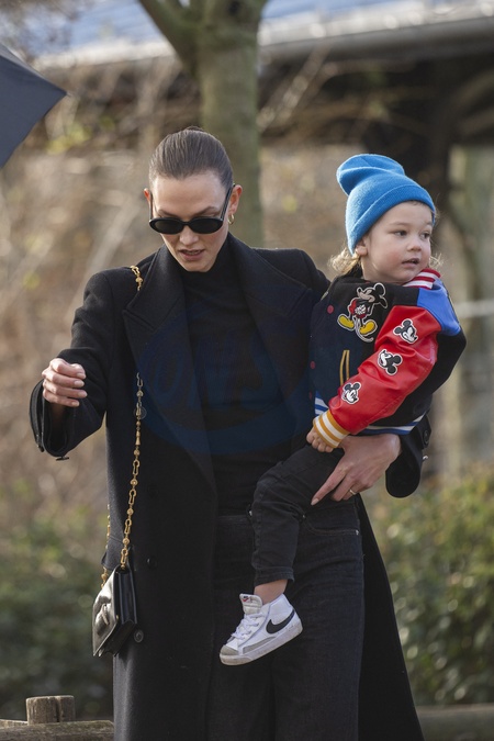 Exclusif - Prix Spécial - No web - Karlie Kloss et son fils Levi jouent au Jardin des Tuileries à Paris en compagnie de Gwyneth Paltrow en marge de la fashion week Haute Couture printemps/été 2024 (PFW) le 22 janvier 2024. Exclusive - No web en Suisse / Belgique Please pixelate child face prior to publication Karlie Kloss and her son play in the Jardin des Tuileries in Paris with Gwyneth Paltrow during the Haute Couture Spring/Summer 2024 (PFW) fashion week on January 22, 2024.