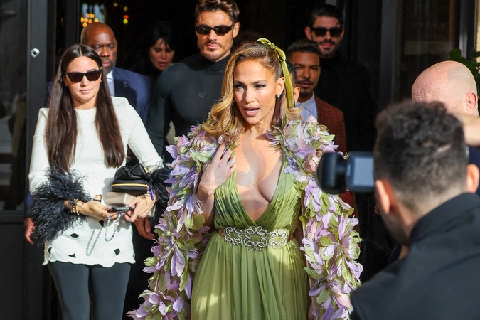 Jennifer Lopez (JLo) à la sortie de son hôtel pour se rendre au défilé Elie Saab Haute Couture Printemps/Été 2024 dans le cadre de la Fashion Week de Paris (PFW)