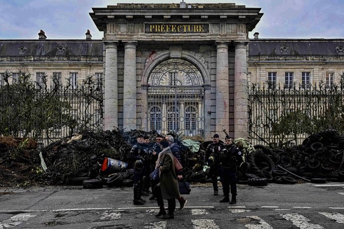Des passants devant la préfecture du Lot et Garonne à Agen. - Manifestation des Agriculteurs du Lot-et-Garonne contre la politique fiscale et la baisse des revenusd, devant le préfecture d'Agen, France, le 24 janvier 2024. © Thierry Breton/Panoramic/Bestimage Farmers block front of the prefecture with tires and trash as they gather to protest against taxation policy and declining income in Agen, France on January 23, 2024.