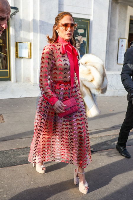 Jennifer Lopez (JLo) à la sortie du restaurant Gigi pour se rendre au défilé Valentino en marge de la Fashion Week de Paris (PFW)