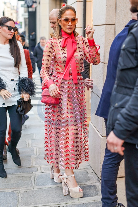 Jennifer Lopez (JLo) à la sortie du restaurant Gigi pour se rendre au défilé Valentino en marge de la Fashion Week de Paris (PFW)