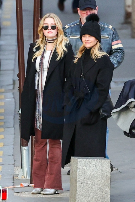 Reese Witherspoon et sa fille Ava Elizabeth Phillippe se baladent dans les rues de Paris, France, le 24 janvier 2024. Reese essaye de passer incognito avec son masque Chirurgical noir. Reese Witherspoon and his daughter Ava Elizabeth Phillippe wandered through the streets of Paris, France, January 24, 2024. Reese tries to pass incognito with her black surgical mask.