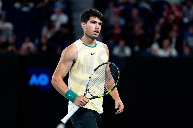 Carlos Alcaraz (ESP) lors du quart de finale de l'Open d'Australie au Rod Laver Arena à Melbourne, Australie, le 25 janvier 2024. A. Zverev gagne 6-1, 6-3, 6-7 [2], 6-4. © Virginie Bouyer/Panoramic/Bestimage Quarterfinals singles match between Carlos Alcaraz of Spain and Alexander Zverev of Germany during the 2024 Australian Open at Melbourne Park on January 24, 2024 in Melbourne, Australia.