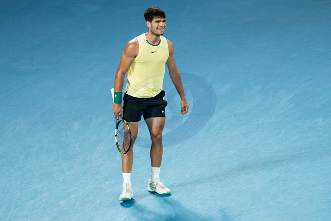 Carlos Alcaraz (ESP) lors du quart de finale de l'Open d'Australie au Rod Laver Arena à Melbourne, Australie, le 25 janvier 2024. A. Zverev gagne 6-1, 6-3, 6-7 [2], 6-4. © Virginie Bouyer/Panoramic/Bestimage Quarterfinals singles match between Carlos Alcaraz of Spain and Alexander Zverev of Germany during the 2024 Australian Open at Melbourne Park on January 24, 2024 in Melbourne, Australia.