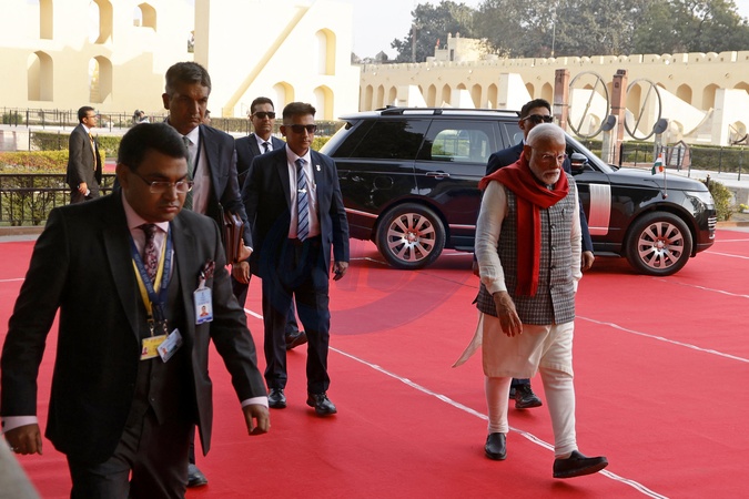 Le Premier ministre indien Narendra Modi arrive au Jantar Mantar à Jaipur le 25 janvier 2024. © Ludovic Marin/Pool/Bestimage India's Prime Minister Narendra Modi (R) arrives at Jantar Mantar in Jaipur on January 25, 2024. President Emmanuel Macron arrives as the guest of honour in India on January 25, 2024, with a sumptuous palace feast and colourful military parade, as France eyes lucrative deals with the world's fifth-biggest economy.