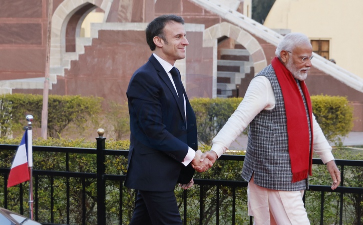 Premier Indii Narendra Modi i prezydent Francji Emmanuel Macron podczas wizyty w Obserwatorium Janta Mantar w Jaipu