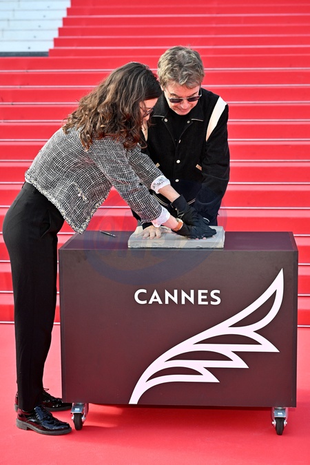 Jean Michel Jarre, marraine et parrains du MIDEM+24, a participé à la traditionnelle prise d'empreintes de mains sur les marches du Palais des Festivals de Cannes, le 25 janvier 2024. Son empreinte rejoindra les 450 autres réalisées pour le "Chemin des Etoiles" de Cannes, créant ainsi une constellation éclatante de talents. © Bruno Bebert/Bestimage Taditional handprint taking on the steps of the Palais des Festivals during MIDEM+24, in Cannes, France, on January 24, 2024.
