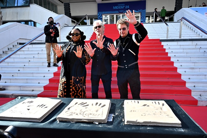 Yemi Alade, Stewart Copeland i Jean-Michel Jarre biorą udział w tradycyjnym odcisku dłoni na schodach Palais des Festivals w Cannes podczas MIDEM+24