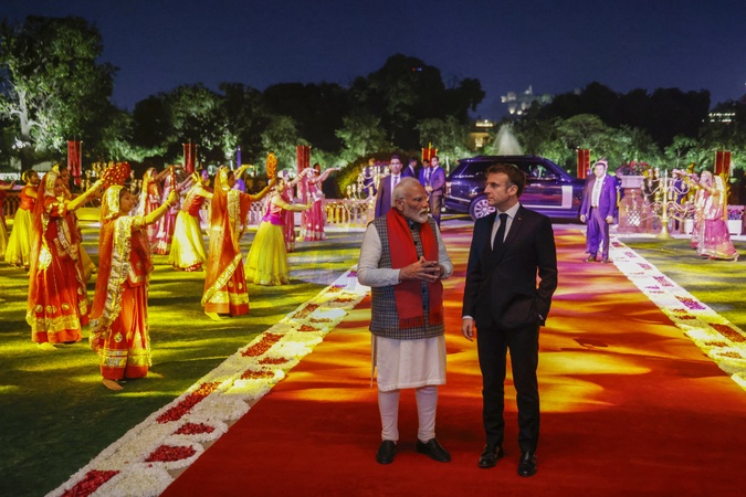 Premier Indii Narendra Modi i prezydent Francji Emmanuel Macron odwiedzają Hawa Mahal, znany również jako Pałac Wiatrów w Jaipur