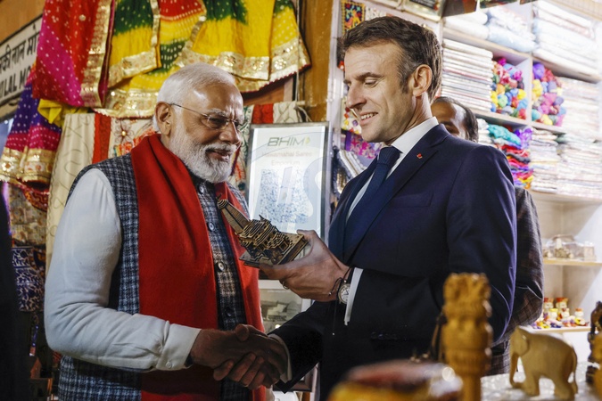 Premier Indii Narendra Modi i prezydent Francji Emmanuel Macron odwiedzają Hawa Mahal, znany również jako Pałac Wiatrów w Jaipur