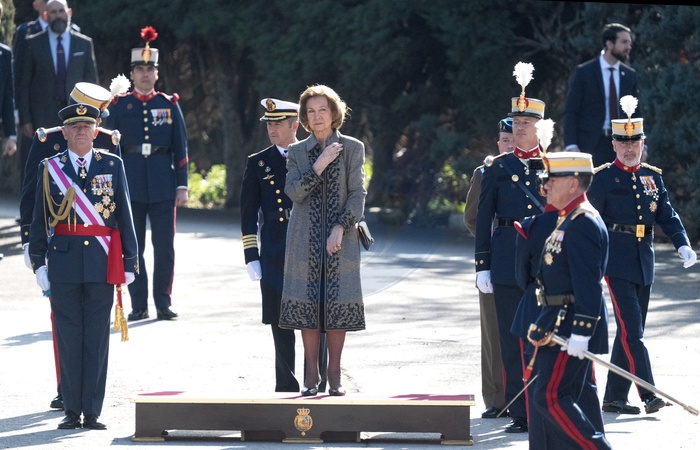 La reine Sofia lors de l'acte de serment devant le drapeau à la caserne "El Rey" de la Garde royale à Madrid, le 26 janvier 2024. Queen Sofia attends the Flag ceremony at the Cuartel del Rey. El Pardo, Madrid. January 26th, 2024.