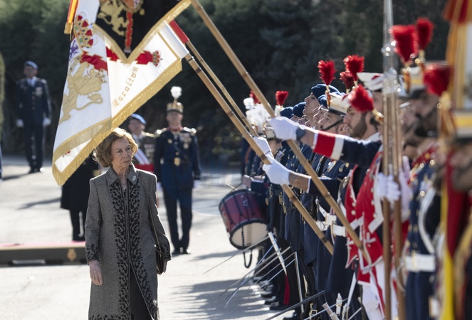 La reine Sofia lors de l'acte de serment devant le drapeau à la caserne "El Rey" de la Garde royale à Madrid, le 26 janvier 2024. Queen Sofia attends the Flag ceremony at the Cuartel del Rey. El Pardo, Madrid. January 26th, 2024.