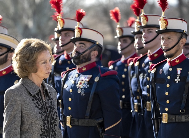 La reine Sofia lors de l'acte de serment devant le drapeau à la caserne "El Rey" de la Garde royale à Madrid, le 26 janvier 2024. Queen Sofia attends the Flag ceremony at the Cuartel del Rey. El Pardo, Madrid. January 26th, 2024.