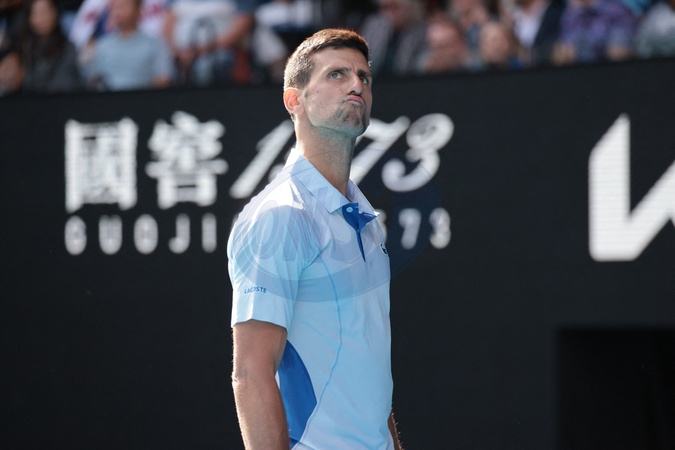 Novak Djokovic éliminé en demi-finale par J.Sinner (6-1, 6-2, 6-7 [8-6], 6-3) lors de l'Open d'Australie à Melbourne, le 26 janvier 2024. © Panoramic / Bestimage Novak Djokovic eliminated in the semi-final by J.Sinner (6-1, 6-2, 6-7 [8-6], 6-3) at the Australian Open in Melbourne, January 26, 2024.