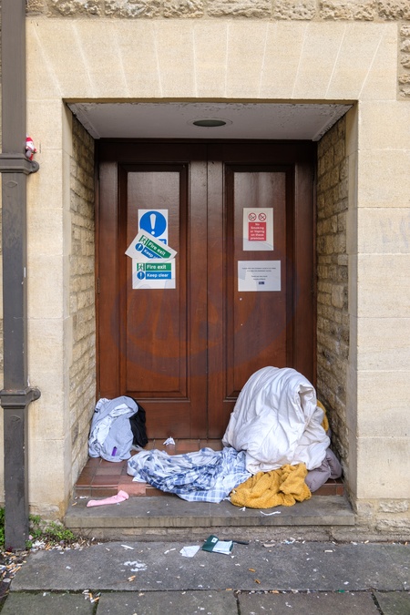 Doorway used for shelter by homeless person.Oxford, Oxfordshire . United Kingdom. 25 January 2024, Credit:Mark Fairhurst / Avalon