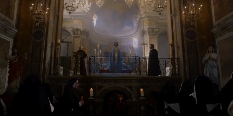 Pictures MUST credit: Neon Euphoria and White Lotus TV star Sydney Sweeney is set to chill fans in a new horror movie where she plays a NUN! The film, titled Immaculate, sees her character Cecilia sent from the USA to a remote convent in Italy. But the trailer shows this is no ordinary convent as it opens during her in confessions sudden being attacked from behind by a pair of hands. There is even more distress later when she becomes ill and is given medical tests which show she is pregnant and it is hailed as an immaculate conception. But the question is what is it she has growing inside her ? The convent itself has mysterious red masked figures who occasionally appear, unspeaking. And one of the scenes shows Sweeney ,26, in blood-soaked white gown being chased across a field by a man. Another scene shows one of the nuns leaping to her death from a balcony. The trailer also sees Sweeney's character relaxing in a large communal bath when suddenly she is grabbed and dragged under the water. Picture supplied by JLPPA_
