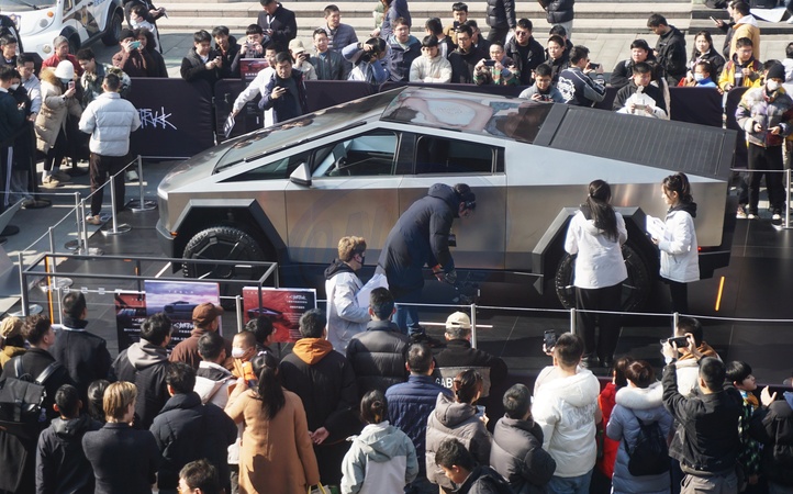 People gather around a Tesla Cybertruck in Hangzhou city in east China's Zhejiang province Sunday, Jan. 28, 2024. Tesla showcases its Cybertruck electric pickup in eight Chinese cities in a promotional campaign., Credit:LONG WEI / Avalon