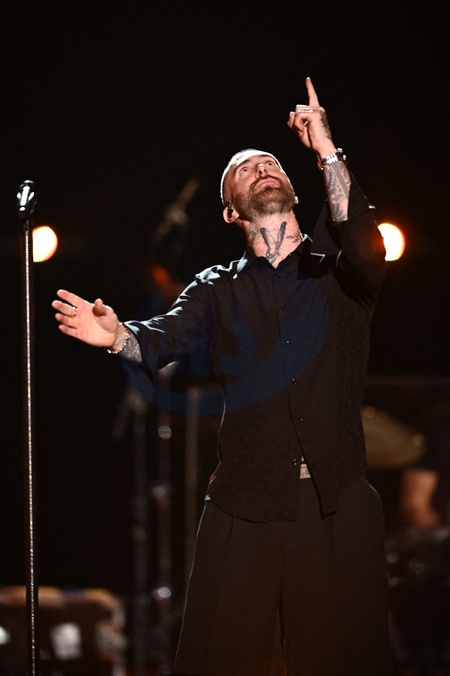 Exclusif - Maroon 5 - Scène - Concert événement "Le gala des pièces jaunes" à l'Accor Arena Paris le 26 janvier 2024. Une soirée de gala exceptionnelle en faveur desPièces Jaunes !De nombreux artistes se succèderont pour chanter pour les enfants et adolescents hospitalisés. © Guillaume Gaffiot / Cyril Moreau / Bestimage Exclusive - No web en Suisse / Belgique Concert event "Le gala des pièces jaunes" at the Accor Arena Paris on 26 January 2024. An exceptional gala evening in aid of the Pièces Jaunes! A host of artists will perform for children and teenagers in hospital.