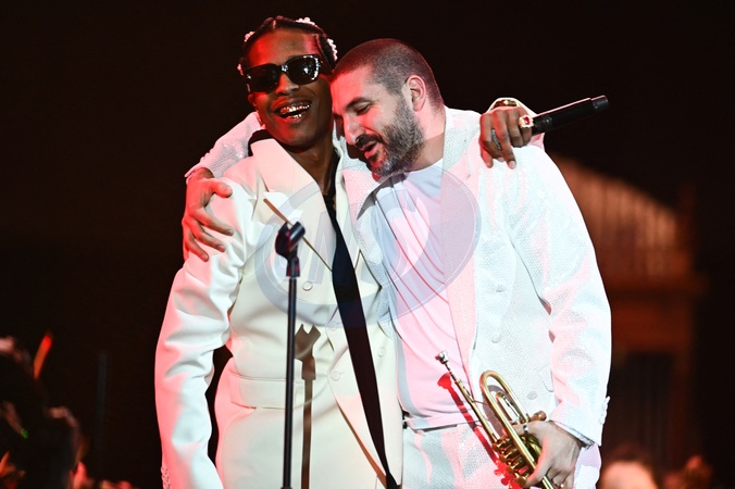 Exclusif - Asap Rocky et Ibrahim Maalouf - Scène - Concert événement "Le gala des pièces jaunes" à l'Accor Arena Paris le 26 janvier 2024. Une soirée de gala exceptionnelle en faveur desPièces Jaunes !De nombreux artistes se succèderont pour chanter pour les enfants et adolescents hospitalisés. © Guillaume Gaffiot / Cyril Moreau / Bestimage Exclusive - No web en Suisse / Belgique Concert event "Le gala des pièces jaunes" at the Accor Arena Paris on 26 January 2024. An exceptional gala evening in aid of the Pièces Jaunes! A host of artists will perform for children and teenagers in hospital.