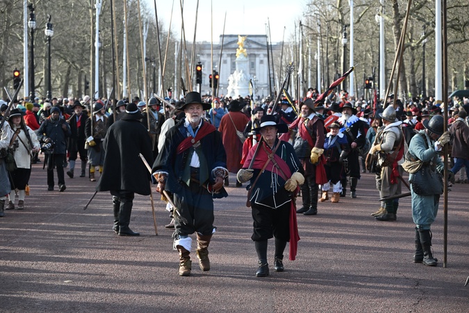 English Civil War reenactors march along The Mall to Horseguards in London, UK, on 28th January, 2024