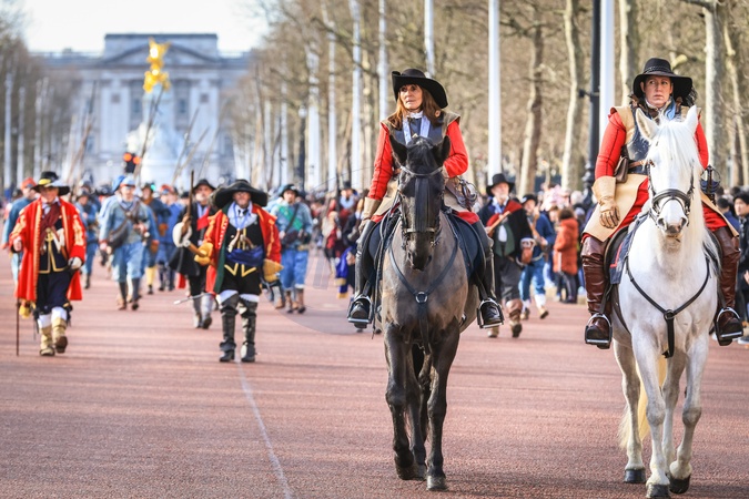 London, UK 28th Jan 2024. The procession on the Mall. Every Year, the English Civil War Society's volunteers with The Kings Army, march along the Mall in central London and to Horse Guards Parade, in Commemoration of Charles I, who was martyred 30th January 1649. Each regiment in the re-enactment consists of officers, muskets, followed by the colour, drummers, pikemen and baggage (women and children)., Credit:Imageplotter / Avalon