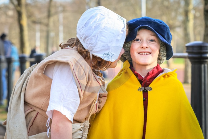 London, UK 28th Jan 2024. (l-t-r) A little kiss for Wilf from Ivy. Children Ivy, Wilf and Joseph assemble to take part in the procession. Every Year, the English Civil War Society's volunteers with The Kings Army, march along the Mall in central London and to Horse Guards Parade, in Commemoration of Charles I, who was martyred 30th January 1649. Each regiment in the re-enactment consists of officers, muskets, followed by the colour, drummers, pikemen and baggage (women and children). The procession is led by the Lord General of the Kings Army, and the horsemen., Credit:Imageplotter / Avalon