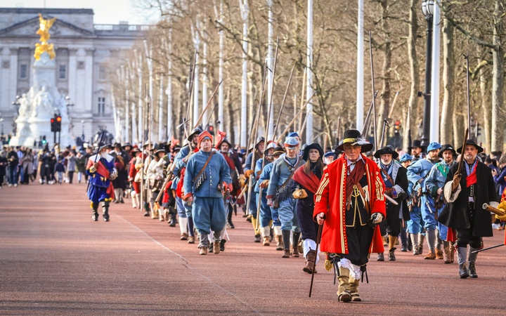 London, UK 28th Jan 2024. The procession on the Mall. Every Year, the English Civil War Society's volunteers with The Kings Army, march along the Mall in central London and to Horse Guards Parade, in Commemoration of Charles I, who was martyred 30th January 1649. Each regiment in the re-enactment consists of officers, muskets, followed by the colour, drummers, pikemen and baggage (women and children)., Credit:Imageplotter / Avalon