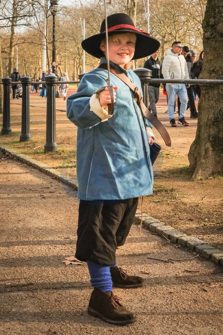 London, UK 28th Jan 2024. Young Joseph gets ready as volunteers assemble and get ready to march. Every Year, the English Civil War Society's volunteers with The Kings Army, march along the Mall in central London and to Horse Guards Parade, in Commemoration of Charles I, who was martyred 30th January 1649. Each regiment in the re-enactment consists of officers, muskets, followed by the colour, drummers, pikemen and baggage (women and children). The procession is led by the Lord General of the Kings Army, and the horsemen., Credit:Imageplotter / Avalon