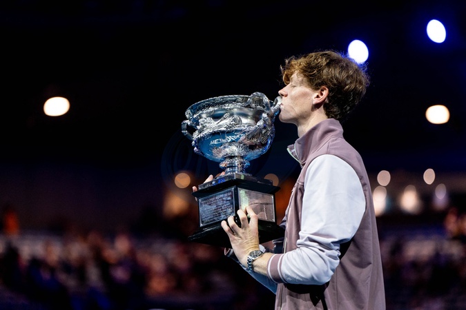 Jannik Sinner (ITA) - J.Sinner remporte la finale de l'Open d'Australie en battant D.Medvedev (3-6, 3-6, 6-4, 6-4, 6-3) à Melbourne, le 28 janvier 2024. © Virginie Bouyer / Panoramic / Bestimage J.Sinner wins the final of the Australian Open by beating D.Medvedev (3-6, 3-6, 6-4, 6-4, 6-3) in Melbourne, January 28, 2024