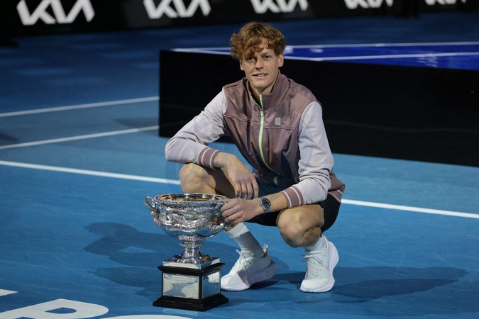Jannik Sinner - J.Sinner remporte la finale de l'Open d'Australie en battant Daniil Medvedev (3-6, 3-6, 6-4, 6-4, 6-3) à Melbourne, le 28 janvier 2024. © Panoramic / Bestimage J.Sinner wins the final of the Australian Open by beating D.Medvedev (3-6, 3-6, 6-4, 6-4, 6-3) in Melbourne, January 28, 2024