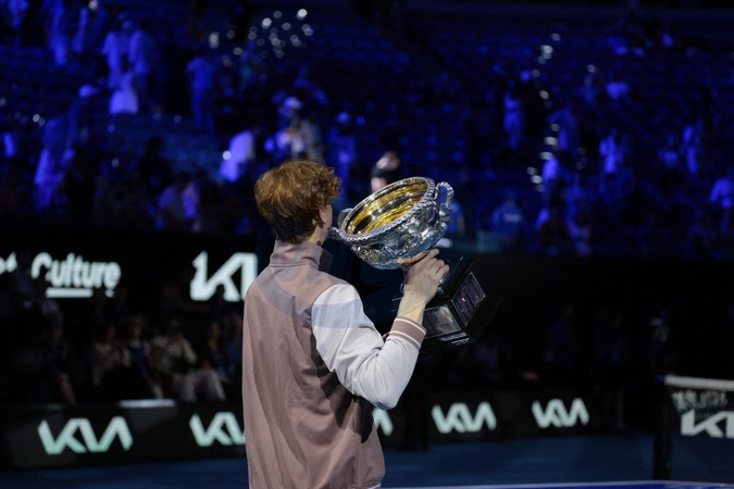 Jannik Sinner - J.Sinner remporte la finale de l'Open d'Australie en battant Daniil Medvedev (3-6, 3-6, 6-4, 6-4, 6-3) à Melbourne, le 28 janvier 2024. © Panoramic / Bestimage J.Sinner wins the final of the Australian Open by beating D.Medvedev (3-6, 3-6, 6-4, 6-4, 6-3) in Melbourne, January 28, 2024