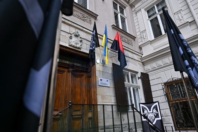 LVIV, UKRAINE - JANUARY 26, 2024 - The first recruiting center of the 1st separate battalion "Da Vinci Wolves" named after Dmytro Kotsiubailo has been opened on Ploshcha Anheliv Square, opposite the Garrison Church, Lviv, western Ukraine., Credit:Anastasiia Smolienko / Avalon