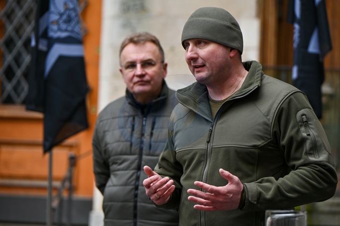 LVIV, UKRAINE - JANUARY 26, 2024 - Head of Lviv Regional Center for Recruitment and Social Support Colonel Artur Niiazov and Lviv Mayor Andrii Sadovyi (R) are pictured during the opening ceremony of the first recruitment center of the 1st separate battalion of Da Vinci Wolves named after Dmytro Kotsiubailo in Lviv, western Ukraine., Credit:Anastasiia Smolienko / Avalon